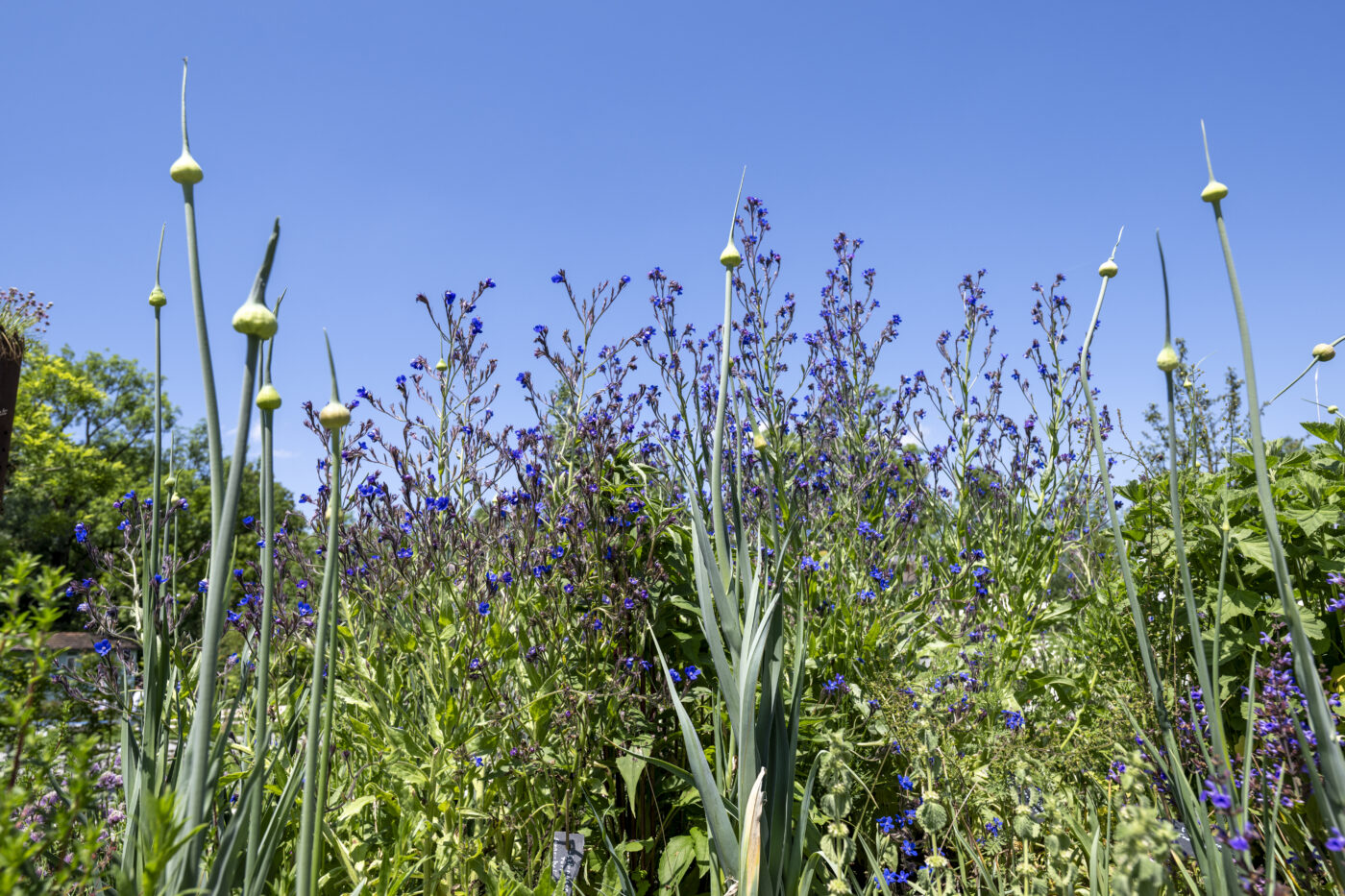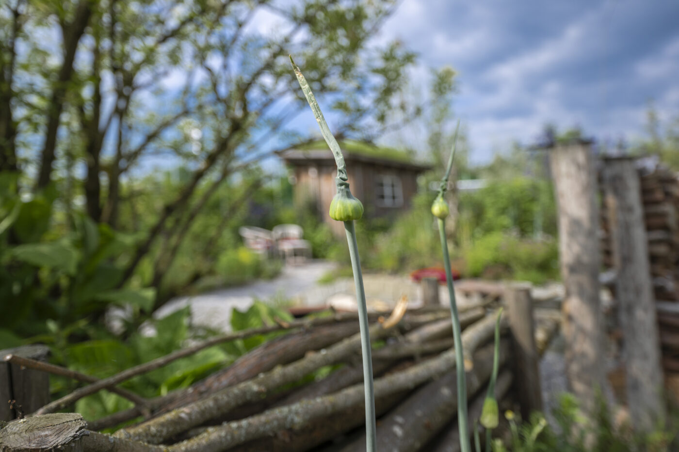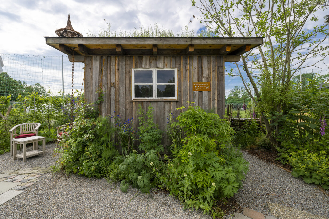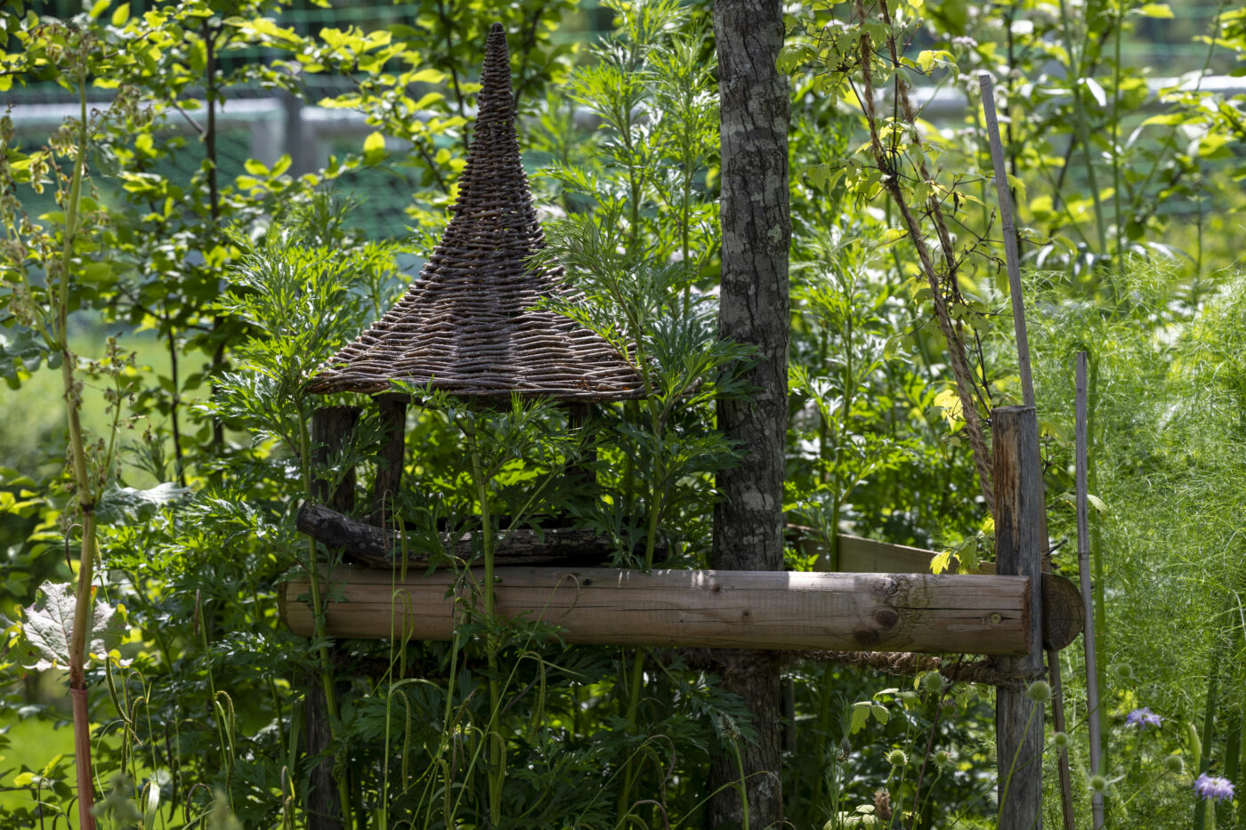 Wie das aussehen kann, zeigt dieser Schaugarten, in welchem dem Regenwassermanagement mit wenig versiegelten Flächen, einem Gründach auf dem Gartenhaus sowie einer Sumpfzone für das Überschusswasser Rechnung getragen wird. Heimisch, essbar, heilend, gesundheitsfördernd oder anderweitig verwendbar, so lauteten die Auswahlkriterien für die vielfältige Bepflanzung. Zugleich dient diese als Nahrung für Vögel oder ist Nektar- und Pollen-Bar für Insekten. Trockenmauern, Totholz, Benjes Hecken,