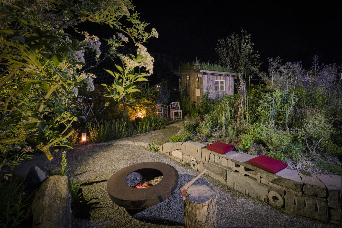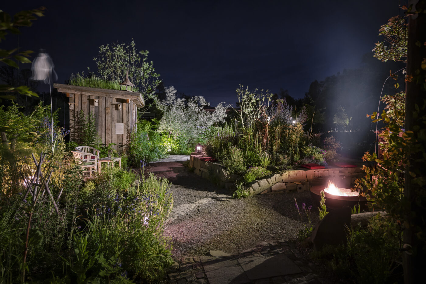 offene Bodenstrukturen, Trocken- sowie Feuchtbereiche fördern in diesem Garten ganz bewusst die Biodiversität, denn diese Details bieten vielen Tierarten wertvollen Lebensraum. Ein besonderer Blickfang ist das Zusammenspiel von Rorschacher Sandstein mit wiederverwerteten Baustoffen als einfassende Sitzmauer des Pflanzhügels. Die versickerungsfähigen Wege aus wassergebundener Decke oder Patchwork-Pflaster mit breiten Fugen führen den aufmerksam Betrachtenden an unzähligen wunderschönen Details wie beispielsweise der Feuerstelle vorbei.